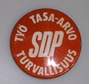 Pyöreä merkki, jonka etupinta muovitettu. Punaisella pohjalla teksti SDP työ tasa-arvo turvallisuus. Takana lukollinen neula.