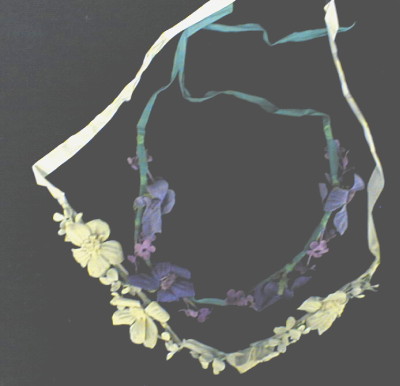 kaksi ilmeiseti päässä pidettävää laakanauhaan kiinnitettyä "kukkäköynnöstä", valkoinen ja violetti. Kiinnitetään nauhalla takaa.