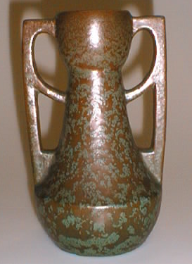 Suuhun ja pohjaan päin levenevä maljakko, jossa voimakkaasti ulkonevat, jugendmaiset kädensijat.