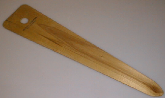 Pitkänomainen vanerilevy, joka kapenee toista päätä kohden, vastakkainen pää suora ja sen lähellä pyöreä reikä. Reijän lähellä valmistetiedot kummallakin puolella esinettä. Pinnassa selluloosalakka.