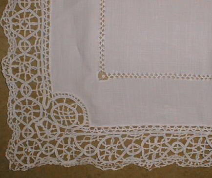 Neliömäinen, reunoja kiertää pitsi. Lähellä reunaa kapea revinnäisraita.