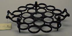 Telineessä 3 jalkaa, joiden varassa yhteenvaletuista renkaista muodostuva vaakasuora alue. Renkaiden pinnoissa koho-ornamenttia. Kaksi pientä kahvaa.