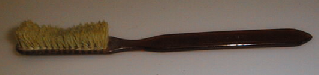 Varsi läpikuultavaa punaista selluloidia, pää muotoiltu kärjekkääksi. Harjaksia tiheästi 5 sentin pituudelta. Harjaksien keskikohta muotoiltu matalammaksi.