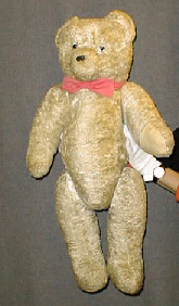 Vaalea isokokoinen nalle, tekoturkista, purulla täytetty. Lasisilmät, kuononpää nahasta. Käpälien ja tassujen pohjat sileää kangasta. Vaaleanpunainen rusetti kaulassa, jonka takaosa kuminauhaa, kiinnitys napilla.