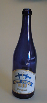 Keilan muotoinen pullo sinistä lasia. Etupuolen etiketissä painatteet: Suomen liput, kultavärillä Suomi-Finland 1999, kuiva hedelmäkuohuviini, jne. Takaetiketissä tuotetietoja, viivakoodi ym.