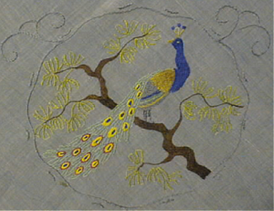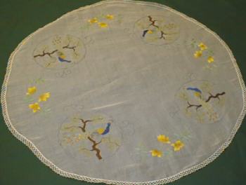 pyöreä pöytäliina, jossa koristeena neljä kirjottua riikinkukkoa oksalla sekä näiden välissä kukkamuodostelmat. Reunaan ommeltuna teollisesti valmistettu pitsi.