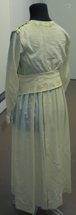 Pitkähihainen pitkä hame, jossa pyöreä pääntie. Koristeena kapea kankaaseen polveilevasti ommeltu nauha. Koristeet pääntiellä, hihansuissa ja edessä boleromaisessa yläosassa, joka jatkuu taakse vyötnä. Kohottettu vyötärösauma.Yläosa huoliteltu hihattomalla vuoriosalla, jossa pitsisomisteet pääntiellä ja hihansuissa.