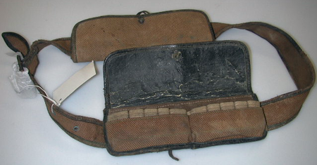 Paperikankainen, nahkapäärmein reunustettu vyö, jossa on kaksi irroitettavaa patruunakoteloa. Patruunakotelot ovat suorakaiteen muotoisia, läpällisiä, jotka on jaettu kahteen eri osaan, joissa molemmissa on paikat viidelle patruunalle. Kotelot on myös valmistettu paperikankaasta ja reunustettu nahkapäärmein, mutta läpän sisäpuoli on valmistettu nahasta ja patruunapaikat leveästä kuminauhasta. Kannen etureunassa on pieni nahkainen pallo, johon kiinnitetään kotelon alareunasta tuleva lenkki. Koteloiden takana on kaksi nahkaista lenkkiä, joiden läpi vyö pujotetaan. Vyössä on nahkapäällysteinen solki ja soljen neula on seosmetallista ja hieman ruostunut. Vyön reiät tuettu seosmetallirenkailla.