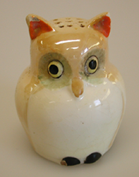 Istuvan pöllön muotoinen sirotin, jossa sirotinreiät ovat keskellä pöllön päätä. Pöllö on muodoltaan pyöreä, josta erottuvat ulkonevat jalat ja korvat. Pöllön selkä on väriltään beige ja maha valkoinen. Pöllöllä on pystykorvat. Sirotin on täytetty pohjassa olevasta pyöreästä reiästä, jossa on ollut korkki. Korkki on painunut sirottimen sisään.