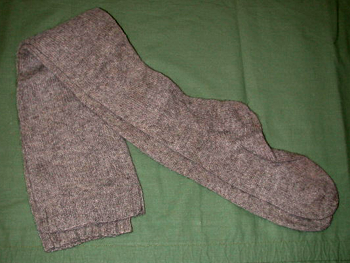 Pitkät naisten villalangasta muotoon neulotut sileää neulosta olevat sukat. Yläreunassa kapea joustinosuus.