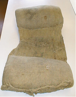luonnonvärisestä säkkikankaasta ommeltu pelastusliivi, joka on tehty kahdesta korkkipurulla täytetystä pussista ja näiden väliin jäävästä kangasosasta.