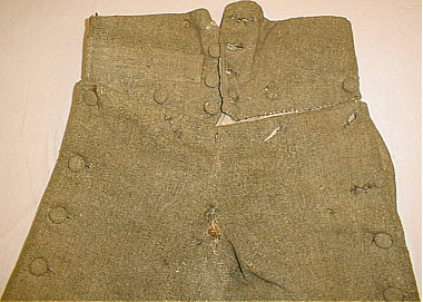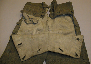 Edestä avautuvat luukkuhousut, karkeata sarkaa, pellavakankaalla vuoritetut. Korkea vyötärökaitale, jossa keskellä edessä neljän päällystetyn napin halkio. Takana vyötäröllä nauhakiinnitys. Housut avautuvat kokonaan nappihalkion avulla molemmista sivusaumoistaan. Keskisauman ympärillä on ollut nahkavahvike, josta on jäljellä pieniä paloja lahkeensuissa sekä tikkausjälki. Oikealla edessä upotettu kaitaletasku.