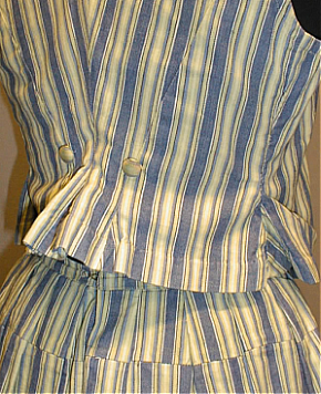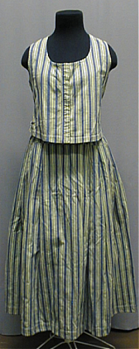 HamePystyraitainen vyötärökaitaleeseen poimutettu hame. Hameen helma on käännetty kaitaleen avulla. Hame on tehty yhdestä kankaspalasta. Hameen yläreunassa 6 cm leveä kaitale, johon hamekangas on ommeltu koneella. Reunoissa ripustusnauhat. Keskellä takana hakasella kiinnittyvä halkio. Hame on vuoriton.JakkuEdestä piilonapituksella kiinnittyvä hihaton jakku. Viisi helmiäisnappia. Pyöreä pääntie. Takana keskellä pienet laskokset eli "körtit" tai "vollit", joiden molemmin puolin kaksi samalla kankaalla päällystettyä nappia. Jakku on vuoriton.