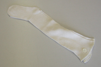 valkoiset vauvan/lapsen pitkälahkeiset sukat, joiden yläreunassa on muovinappi. Neulos on joustinneulosta 1 o, 1 n. Suuosassa vahike erilaisella neuloksella.