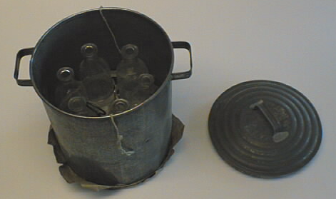 Lieriön muotoinen kattila, jossa painettava kansi. Sisällä pellistä tehty, valkoiseksi maalattu teline, jossa 6 tuttipulloa. Yhdessä mitta-asteikko, muut sileitä. Telineen nostokahva katkennut, sitä korvaa telineeseen sidotut kaksi narunpätkää. Astian alapohja nokinen, sitä peittää paperi, joka on sidottu narulla.