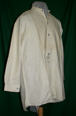 pitkähihainen, edestä vyötärölle asti napitettava, toimikassidoksinen puuvillapaita, jossa pieni pystykaulus ja edessä kolmen metallinapin halkio. Hihansuissa yhden napin napitushalkio. Pitkän paidan helma on takaosastaan pitempi. Sivusaumoissa on 12-15 cm halkiot. Valkoisessa kankaassa on sinisiä raitoja. Olkapäällä kaarroke. Edessä halkiossa leimoja allekkain: 2SAInt43