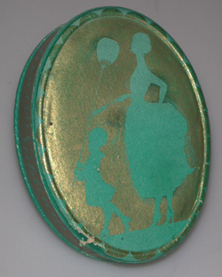 soikeanmutoinen, kannellinen rasia, johon kuviot on tehty kullalla turkoosille pohjalle. Kannen ulkoreunaa kiertää turkoosinvärinen teksti kultaisella pohjalla: Fazer Choklad Fazerin Suklaata. Kannessa on silhuettikuva naisesta, jolla on viuhka kädessä ja takaata koholla oleva hame; ja poika, jolla on kädessään pitkävartinen viuhka ja päästä lähtee sulka. Rasian pohjaosan reuna on pystyvaollinen ja sen pohjassa on tekstit: A.B. KARL FAZER O.Y. HELSINKI - HELSINGFORS. N:o 250. A.B. F. TILGMANN O.Y. Kotelotehdas - Askfabrik.