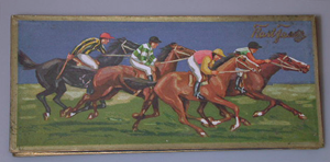 suorakulmion muotoinen rasia, jossa kansi ja pohjaosa. Pohjaosan ulkoreuna on kullanvärinen ja sisäpuolella on paperinen pitsireunus. Pohjassa teksti: No 1432. Kannen alareuna on sininen ja kannessa on neljä ratsastajaa ratsuineen vihreällä nurmella kisaamassa. Kuva on rajattu kullanvärisellä nauhalla. Oikeassa yläkulmassa teksti: Karl Fazer.