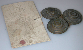 Puolipallon muotoiset messinkinapit, jonka alapinnassa napin levyinen kiinnityslista. Nappi on kupera, joka nousee vyöhykkeittäin ylös keskeltä. Napin keskiosan ympärillä on viivakoristelu. Mukana numerolappu, joka hyvin likainen.