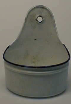 Ovaalin muotoinen pohja, seinä kohoaa takaosassa kaartuen, siinä reikä ripustamista varten. Suureunassa sininen raita, sen alla kevyt profilointi.