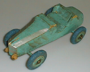 Pitkänomainen kilpa-auton muotoinen puulelu. Runko yhdestä puusta, ei kattoa. Etuosa suippenee, konepellin päässä kapea vako pitkittäin. Lamppuja markkeeraa kaksi korkin palaa, jotka kiinnitetty nauloilla eteen. Hopean väriset maalaukset konepellissä. Pyörät siniset nokian kumipyörät, akselit metallia. Tuulilasin kohdalla kapea rako. Alapintaa koverrettu poraten ja lohkoen puuta.