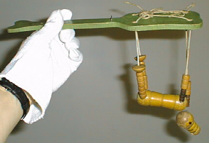 Varrellinen luun muotoinenlauta, jossa 4 reikää kulmissa. Reikien kautta kulkee naru, joka laudan toisella puolella pujotettu sorvattujen puunappuloiden kautta, jotka yhdistyvät Pluto-koiran vartalossa. Nappulat notkuvat nivelikkäästi, kun laudan alapuolelta vetää narusta.Koiran vartalo ja pää maalattu keltaisiksi, raajat lakattua puuta, lauta vihreä. Laudassa jono reikiä ja niitti.