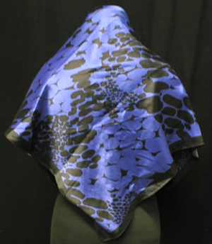 neliön muotoinen sininen huivi, jossa läiskikkäitä mustia kuvioita, satiinipintainen.