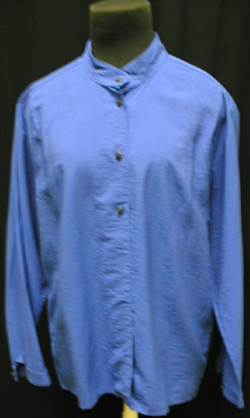 pystykauluksinen naisten edestä avautuva paitapusero.Edessä napitushalkio, 7 pientä mustaa nappia. väriltään kirkkaan sininen. Pitkähihainen, hihansuissa napitushalkio, 1 nappi kiinnikkeenä.