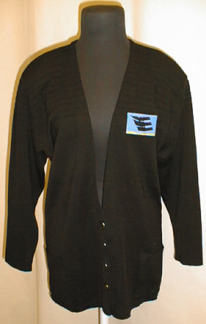 Edestä neljällä napilla avautuva villatakki, jossa molemmin puolin paikkataskut. Vasemmalla puolella Espoon kulttuurikeskuksen kangasmerkki eli "logo". Irrotettavat olkatoppaukset. Takki on tiivistä mustaa neulosta.