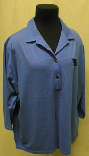 Lyhythihainen sininen paita, joka sulkeutuu kahdella helmiäisnapilla edestä. Paitakaulus, vasemmassa etuosassa kirjottu Kulttuurikeskuksen merkki. Valmistaja Arola.
