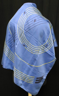 Neliön muotoinen huivi, jossa viivakuvioista muodostuvia ympyröitä ja kulttuurikeskuksen tunnuksia.