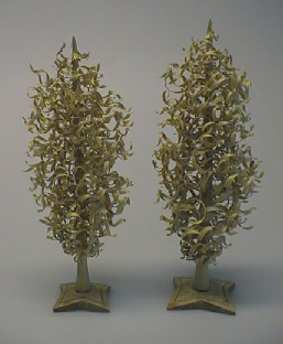 Yhdestä puulistasta veistetty spiraalimaisia lastuja. Liimattu neliskulmaiseen alustaan, jonka sivujen keskikohdat menevät hieman sisäänpäin.
