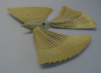 Kuusesta vuoltu puinen lintu, jonka vartalo ja pyrstö on vuoltu yhdestä kappaleesta. Vartalon sivuille on upotettu molemmin puolin siivet. Pyrstö ja siivet on vuoltu listoista ja niissä on puolivälissä kolo, jonka avulla ne menevät limittäin. Lisäksi ne on liimattu toisiinsa. Linnun vartalossa on myös taivutettu nuppineula, joka toimii ripustuskoukkuna.