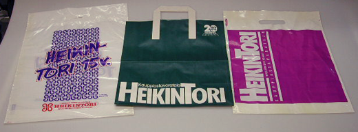 Valkoinen suorakulmion muotoinen muovikassi, jonka yläreunassa on kädensija-aukko. Kassin keskellä on sinisiä hannunvaakuna kuvioita, jonka päällä lukee HEIKINTORI 15 v. ja toisella puolella HEIKINTORIKASSI. Kassin alareunassa lukee punaisella: TAPIOLAN SUURIN TAVARATALO HEIKINTORI ESPOO TAPIOLA PUHELIN 90-460 811.