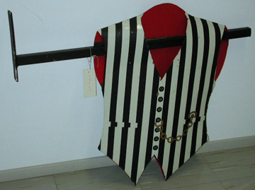 Raudasta valmistettu vaakasuora, musta tanko, jonka päähän on kiinnitetty kiinnityslevy, jossa kolme reikää ruuveille. Tankoon on kiinnitetty peltinen miesten liivi hihansuista lävitse. Liivi on musta-valko pystyraidallinen, jonka sisäosa on punainen. Liiviin on maalattu mustat napit ja kellon perillä varustettu taskukello taskussa. Liivin helmat ovat kolmiomaiset.