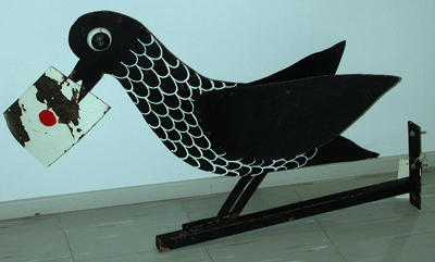 mustaksi maalattu seinään kiinnitettävä rautatanko, jonka yläreunaan on kiinnitetty musta pellistä valmistettu lintu. Linnulla on valkoinen kirje suussaan, jossa punainen sinetti. Linnulla on pallomaiset silmät, siivet pystyssä ja sille on maalattu valkoisella sulkien ääriviivoja.