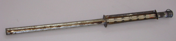 Pellistä valmistettu tanko, jonka yläosassa on lämpömittari. Lämpömittari on lasista, jonka asteikko on 40:stä 100:aan asteeseen. Tangon päässä on kierteinen korkki, jossa jengat. Korkki ei irtoa tangosta. Korkin päähän on kiinnitetty ohut lenkki, ilmeisesti nostamista varten.