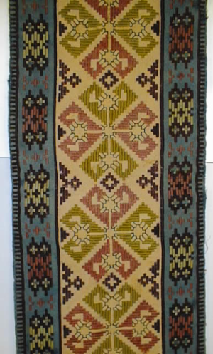 Keinutuolinmatto, joka on kirjottu pääosin laakapistokirjonnalla geometrisin aihein. Lisänä etupistokirjontaa. Maton kangas on sinistä villakangasta. Vuorikangas vaaleanpunaista tikattua villakangasta. Sininen kangas on erityisesti keskiosastaan pahoin haalistunut. Osa kirjonnasta on lähes kokonaan kulunut (keltainen, merseroitu puuvillalanka).