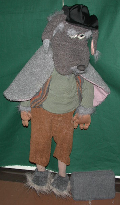 Harmaa tekoturkiksesta valmistettu koira, jolla on yllään vihreä trikoopaita, ruskeat froteehousut, raidallinen liivi ja harmaa tekoturkisviitta. Päässään musta tekokuidusta valmistettu hattu. Koira on puurunko, joka on päällystetty vanulla ja sukkahousulla. Selässä sillä on puinen keppi nuken ohjailua varten. Laukku on valmistettu styroksista, joka on päällystetty harmaalla trikoolla. Laukku on suorakaiteen muotoinen.