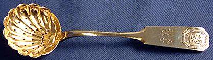 Pieni palkintokauha.pesä säteittäisesti aaltomainen, reiällinen, levenee yläreunaan kullattu.varsi sileä, pääty leveä, siinä kaiverrukset ja merkki juotettuna
