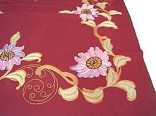 Neliön muotoinen pöytäliina, jossa kulmissa ja sivun keskellä suuri kukka- ja lehtikuvio