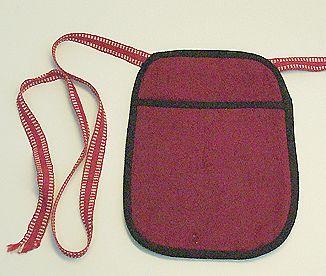 Suorakaiteen muotoinen, kulmistaan pyöristetty irtotasku, jossa päällyskangas t.punaista villapomsia, vuori punaista puuvillapalttinna ja sisävuori valkoista pellavapalttinaa. Taskun reunat on huoliteltu mustalla kaitaleella ja sen yläreunaan on kiinnitetty punavalkoinen pirtanauha.
