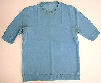 Lantiolle ulottuva suoralinjainen, lyhythihainen pusero sileää neuletta. Pääntie pyöreä, siinä kapea neuloskanttaus. Helmassa ja hihansuissa leveähkö 1x1 resori.