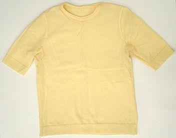 Lantiolle ulottuva suoralinjainen, lyhythihainen pusero sileää neuletta. Pääntie pyöreä, siinä kapea neuloskanttaus. Helmassa ja hihansuissa leveähkö 1x1 resori.