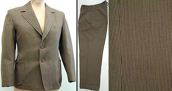 Takki: loivasti vartalonmyötäinen puvun takki, jossa yksirivinen napitus.Kapea herrainkaulus, suorat hihat, hihansuissa nappirivi. Paikkataskut, rintatasku. Vuorissa povitasku. Housut: kapeahkolahkeiset puvun housut. Lahkeiden suissa käänteet. Vyötäröltä löysähköt. Etutaitteissa pieni avovekki, edessä nappikiinniytys. Upotetut taskut sivusaumoissa sekä takatasku. Kapea vyötärönauha, siinä vyölenkit sekä napit olkaimia varten. Keskiedessä jälkeenpäin lisättu iso hakanen.