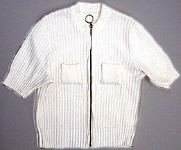 Lantiolle ulottuva, lyhythihainen neulepusero 3x3 neulosta. Keskiedestä avoin, kiinnitys paksuhkolla, lenkkipäisellä metalliketjulla. Molemmin puolin pienehköt rintataskut 2x2 neulosta. Pääntie pyöreä, reunassa leveähkö kaksinkertainen resorineulos. Helmassa ja hihansuissa leveähkö resori.