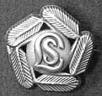 Viiden kuusenhavun ympäröimä, viisikulmainen merkki. Keskellä on ympyrä ja siinä tyylitelty L-kirjain ja sitä pienempi S-kirjain. Takana neulakiinnitys.