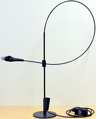 Pöytävalaisin halogeenilampulla. Musta, metallinen. Jalustana pyöreä litteä laatta, jonka keskeltä nousee ohut varsi. Varren alaosassa katkaisin. Varsi kaartuu ylhäällä silmukaksi, jonka päässä on pienehkö kaksiosainen varjostin. Silmukan ja pystyvarren yhtymäkohdassa on hissilaite, jolla varjostimen korkeutta voi säädellä. Valaisimessa kiinteä johto ja muuntaja.