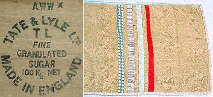 Sokerisäkistä tehty suorakaiteen muotoinen matto. Reunat huoliteltu kankaalla. Mattoon ommeltu vanhoista ? kankaista leikattuja poikkiraitoja.