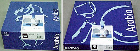 Kulhon pakkauslaatikko: Arabian Arctica-sarjan kulhon alkuperäinen pakkauslaatikko. Neliön muotoinen pakkaus, avataan päältä. Kanteen liimattu etiketti, josta näkyy Arctica-sarjan esineitä. Paistivadin pakkauslaatikko: Arabian Arctica-sarjan paistivadin alkuperäinen pakkauslaatikko. Matala, neliömäinen pakkaus. Kanteen liimattu etiketti, josta näkyy Arctica-sarjan esineitä.
